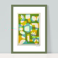 Only one of each, screen printed by hand, using positive stencils to create two layers of negative space printing to reveal a three colour combination of playful shapes
