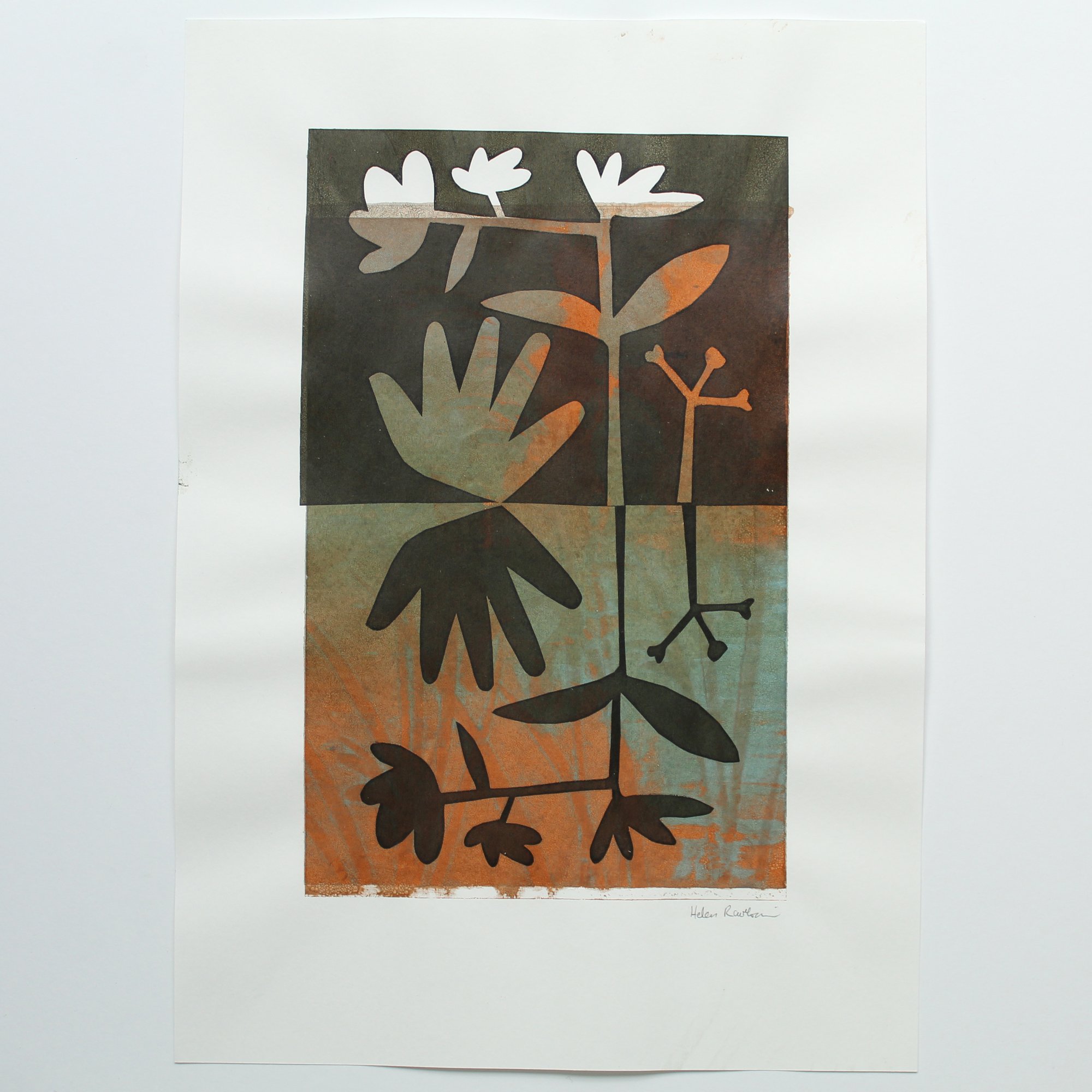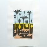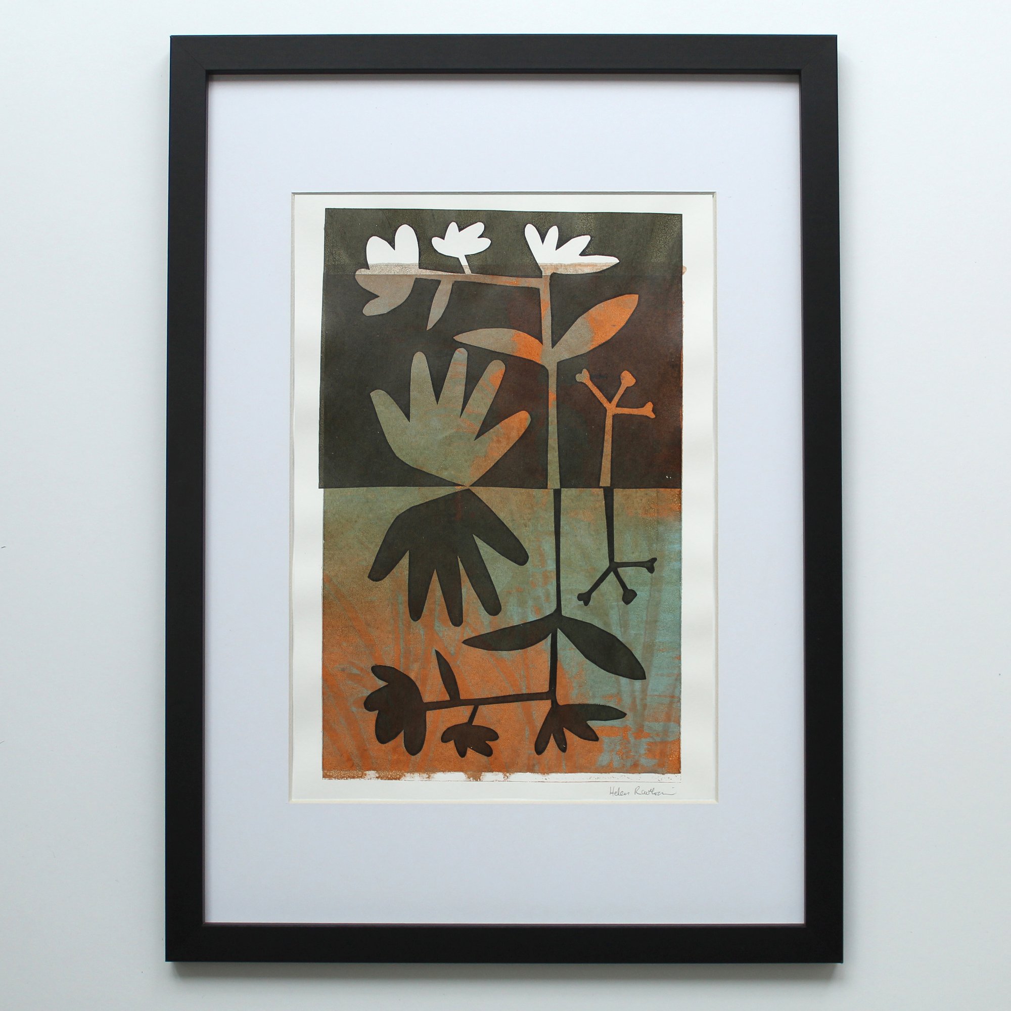 Playing around with positive and negative space and botanical shapes. Created from cutting paper stencils and layered colour screen printing. Each one is slightly different.