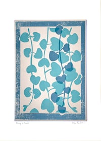 Beautiful strings of heart shaped leaves printed in aqua sky blue and chalky blue grey within a textured print framework.